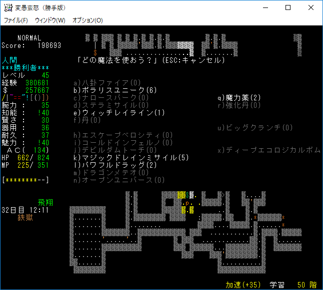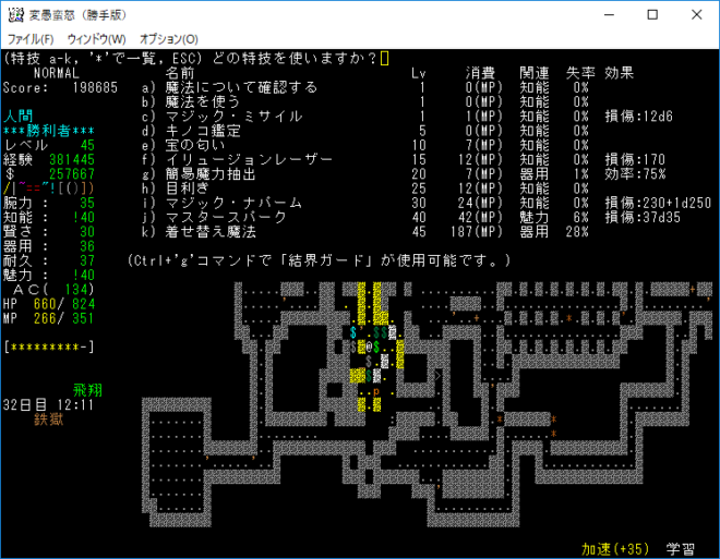 次回も鉄獄を探索します。レベルが45になったから魔力の嵐を学習します。本家と同じく固定500ダメージだよね。第1領域を暗黒に変えたくなってきました。幽体化が無くなっているんだっけ?