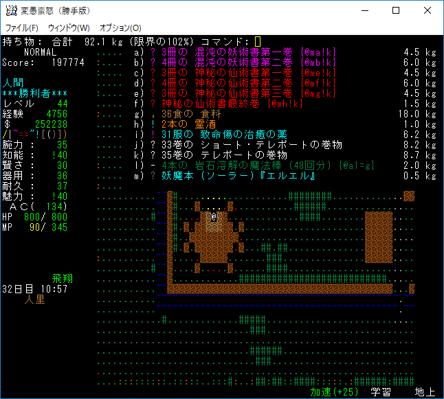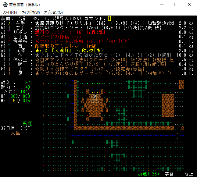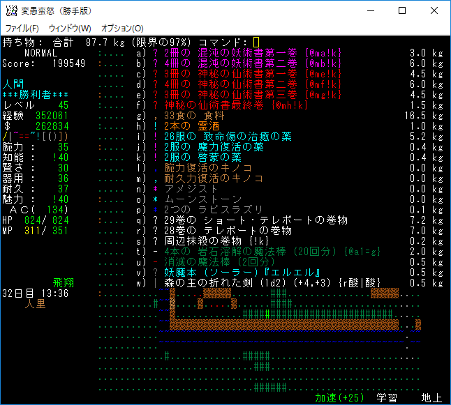 いくつかアイテムを拾って人里に戻りました。消滅の魔法棒は強いね。死の騎士に使ったら一瞬で消えた。折れた剣も持ち帰ってきたよ。私のプレイしていた頃の変愚は武器修復というシステムが無かった。強い武器を作れるのかは知らない。