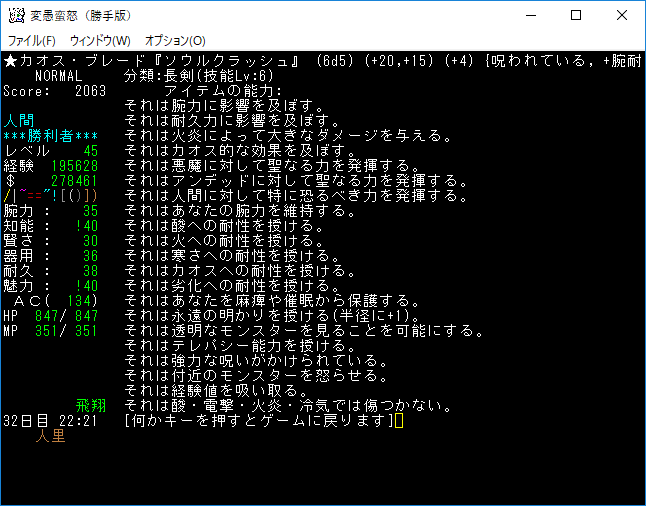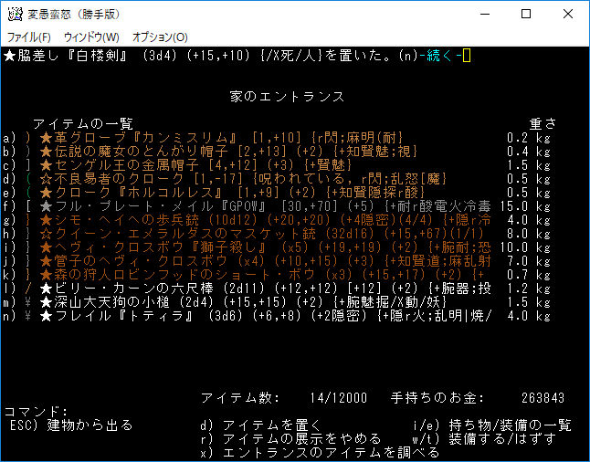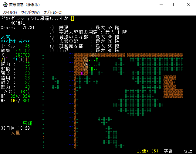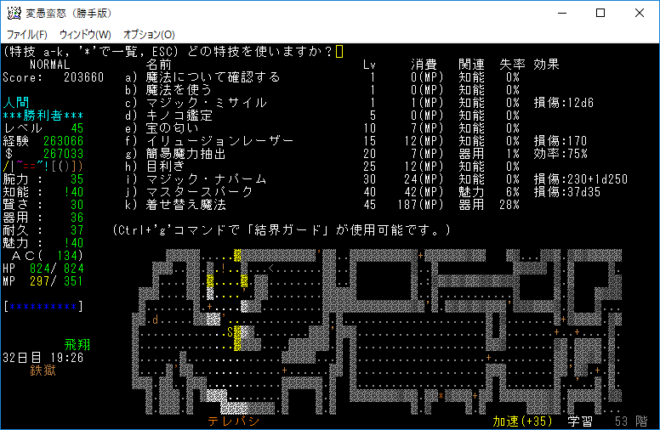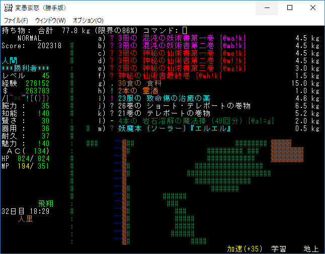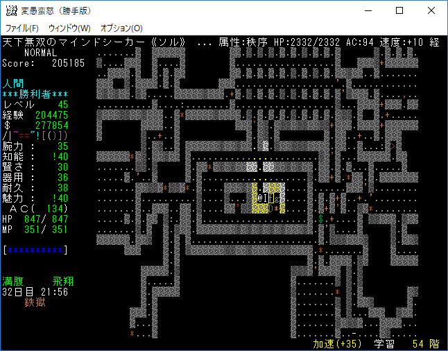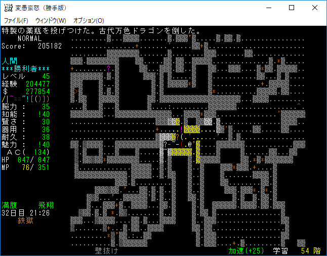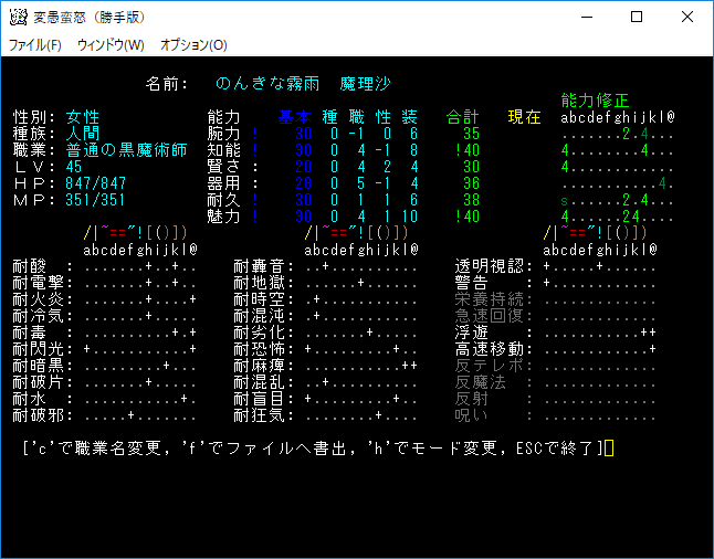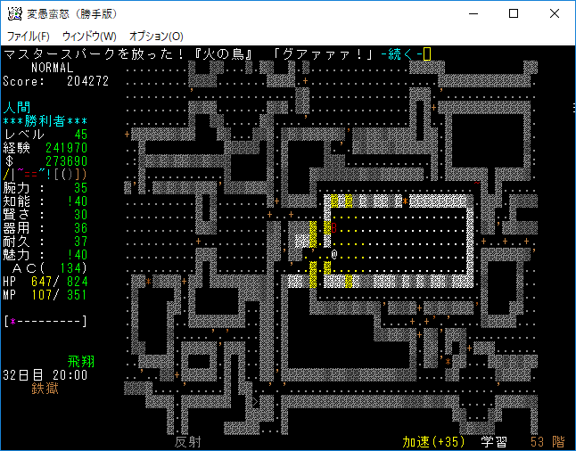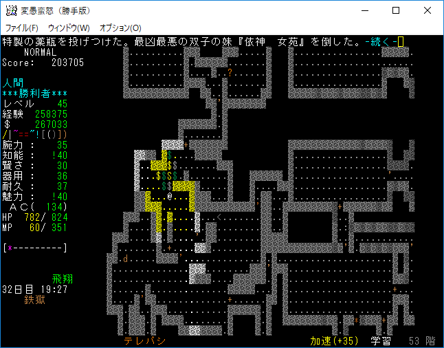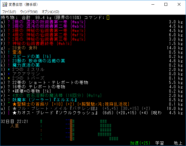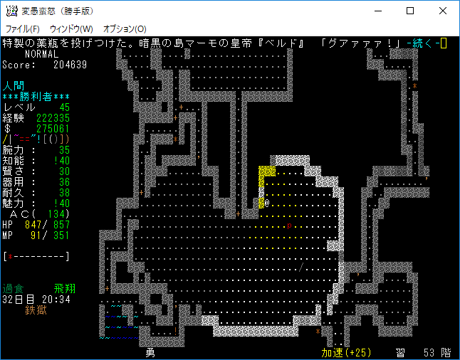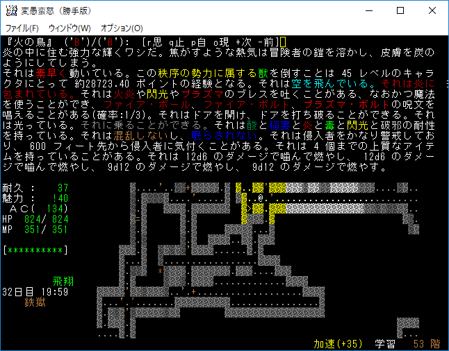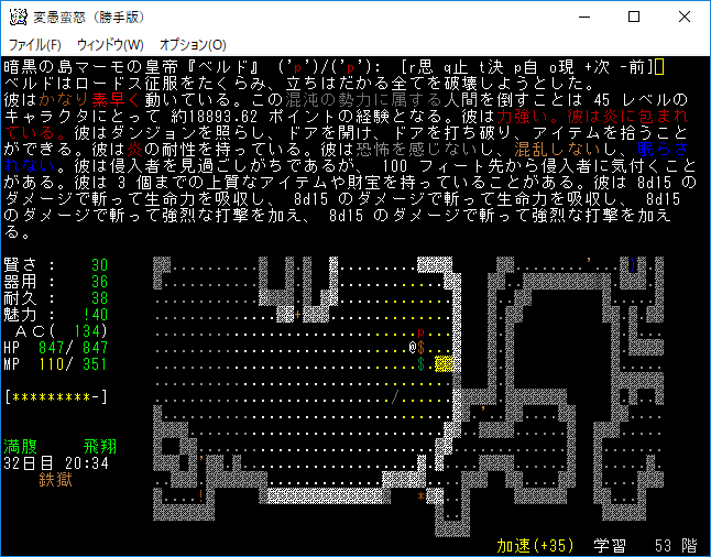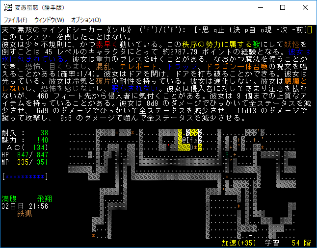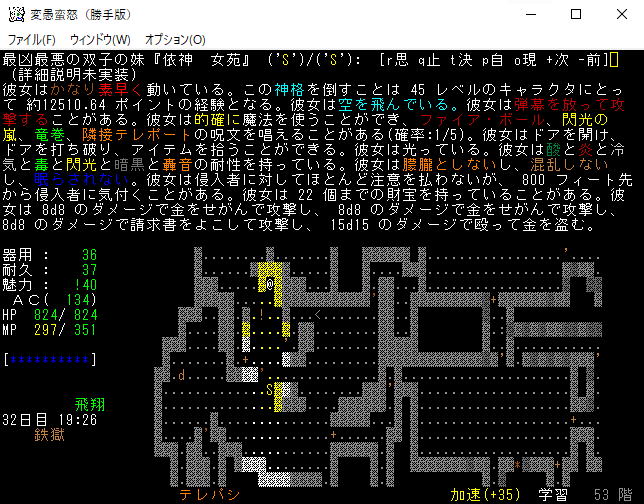おはようございます。変愚蛮怒東方Project勝手版のプレイ日記を始めます。56階ランダムクエストを目指して鉄獄を攻略中。ユニーク狩りが楽しい。マッタリ進めています。