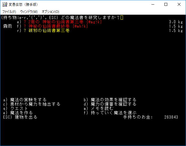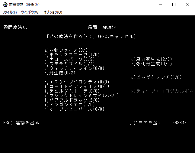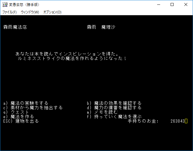 霧雨魔法店にて現在作成可能な自作魔法を確認。なんだか違和感を覚えるんだよなあ。『g』の魔法が無いよね!?『g』は破邪の3冊目だ。