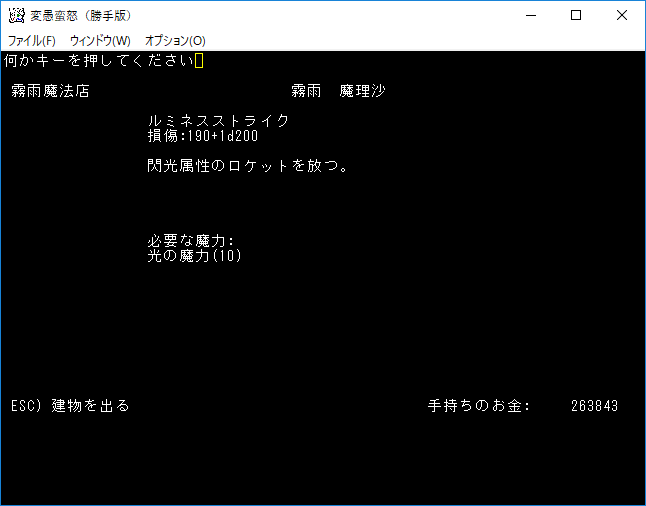 自作魔法『ルミネスストライク』を作成可能になりました。『イリュージョンレーザー』よりも威力が高いね。素材が安いから持ち歩くのも悪くはない。だけど地下50階以降のユニークに撃つには物足りないかなあ。