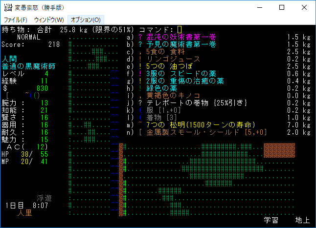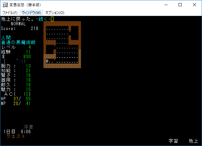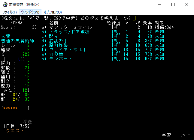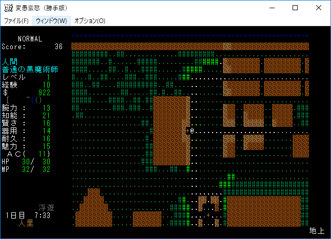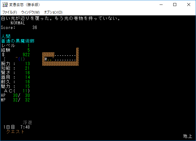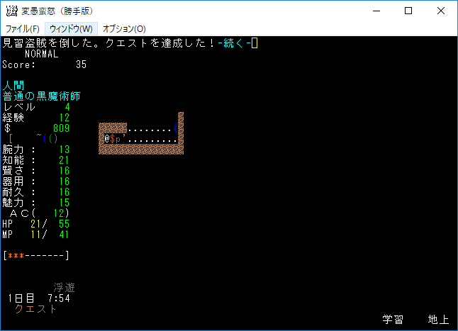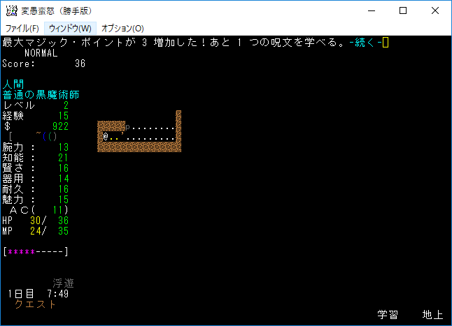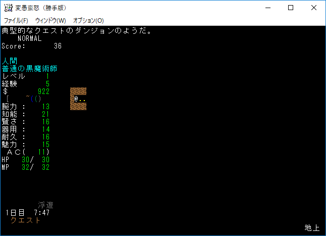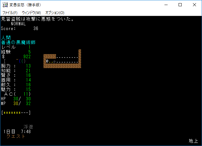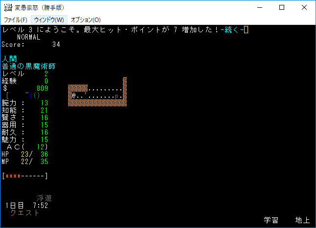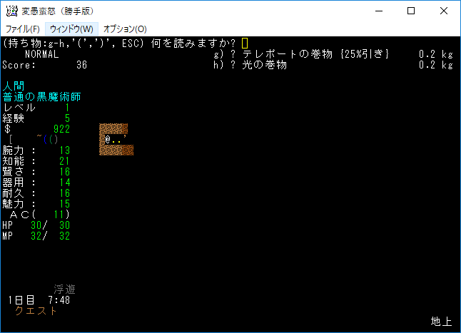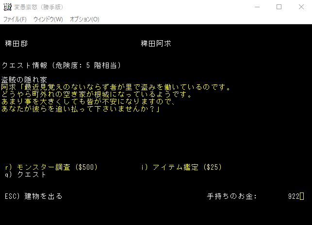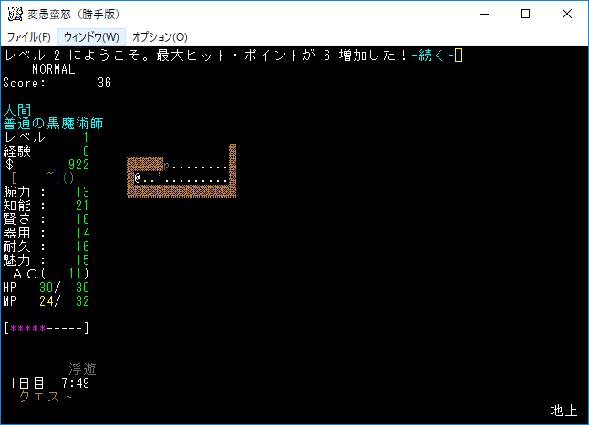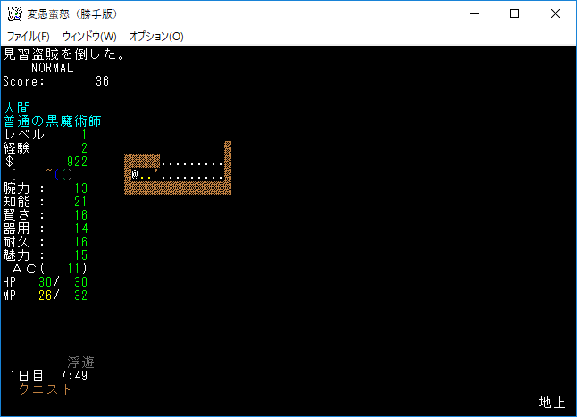 本家、変愚蛮怒とは違いスタートの街にダンジョンが無いようです(たぶん)。レベル上げとアイテム集めに最適な盗賊のクエストをクリアして魔理沙を強くします。