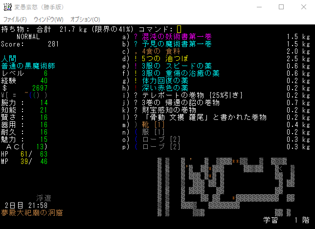 2回目の探索結果は以上のようになりました。未鑑定の薬と巻物は店で売って鑑定をします。今度こそ麻痺耐性の防具を買いたい。