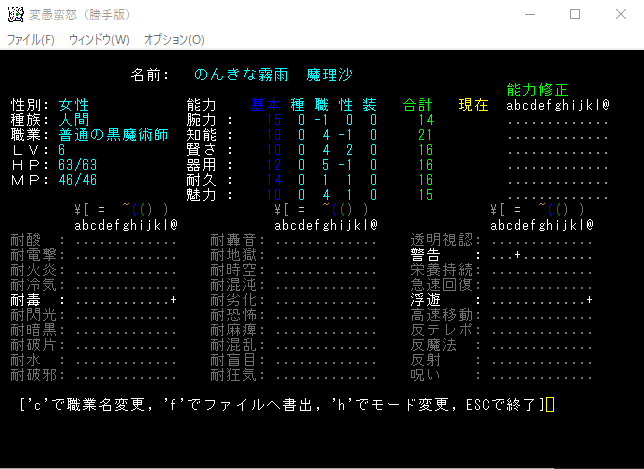 現在の耐性は上の図になります。魔理沙は毒耐性を持っているのですね。