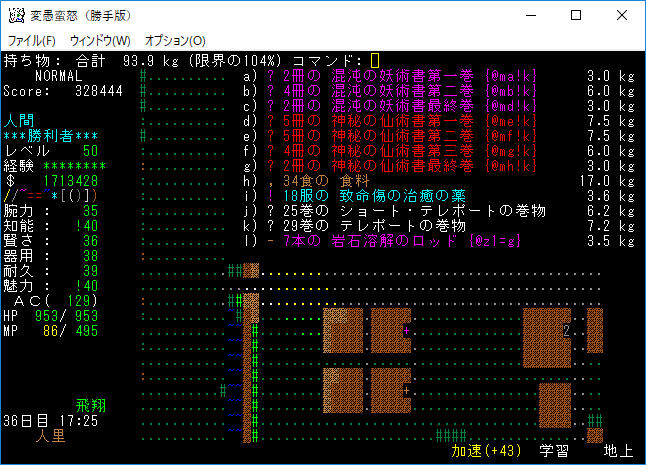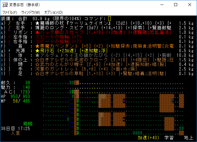 装備は前回と同じです。もう適当な小手にアーティファクト生成の巻物を読んじゃおうか。ドラゴン・グローブを拾うのは諦めた。