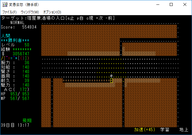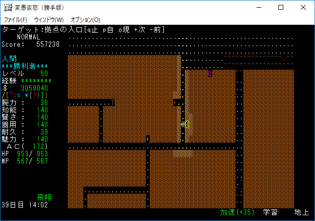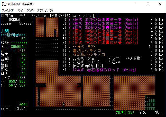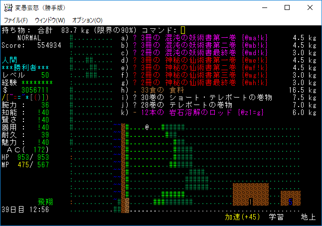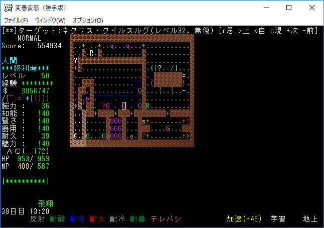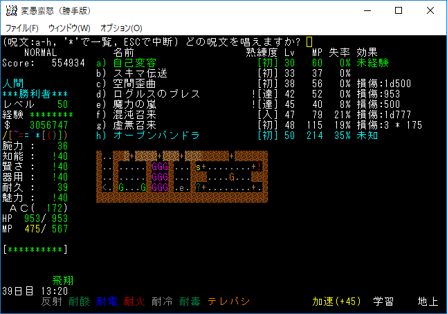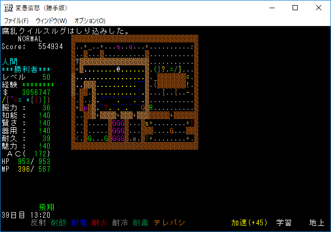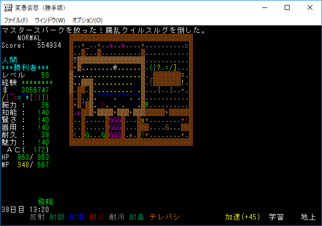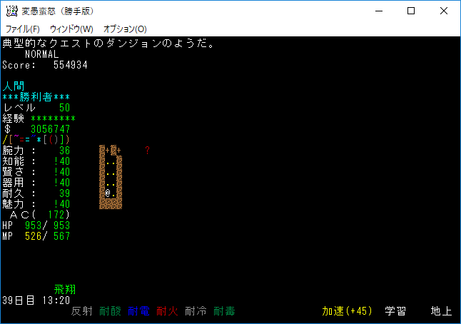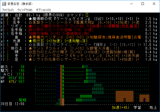 装備は変わっていません。幽霊屋敷を失敗しているダンプは多いはずだ(俺が変愚をやっていた当時)。自分はゲーム開始時に幽霊屋敷へ突撃をしていました。テレポートを繰り返してアイテムを回収できれば序盤が楽になるからです。隠密の高い種族じゃないと無理だけどさ。