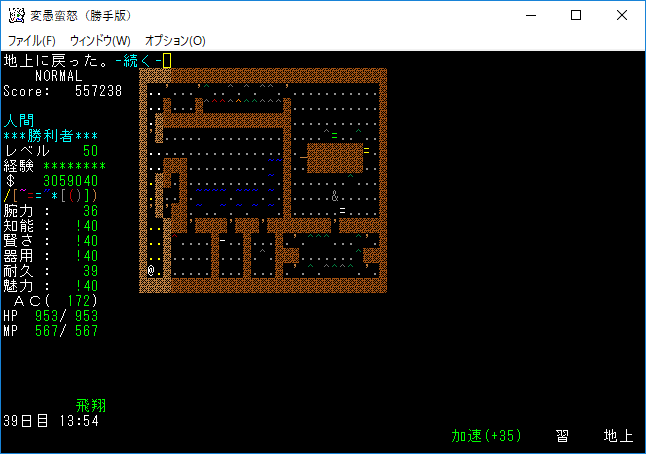 とくにめぼしい収獲もなく地上へ帰還をしました。抹殺の巻物を拾ったみたいだね。俺は抹殺を上手く使ったことがありません。失敗した後の反撃が怖くてテレポートレベルや*破壊*ばかり使用していた。