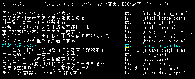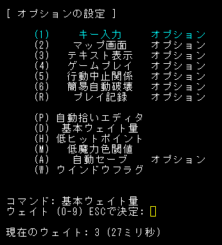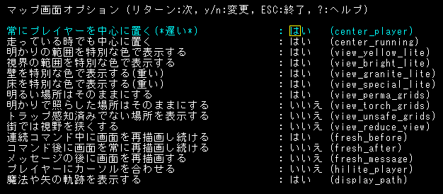 今日の探索はここで中断をしよう。最序盤は難しいから落ち着いた方が良い。オプションでも変更をしようか。『常にプレイヤーを中心に置く』を『はい』にする。