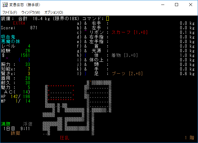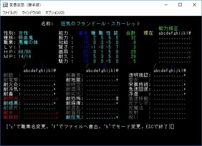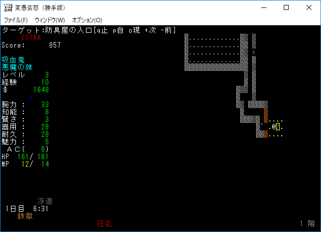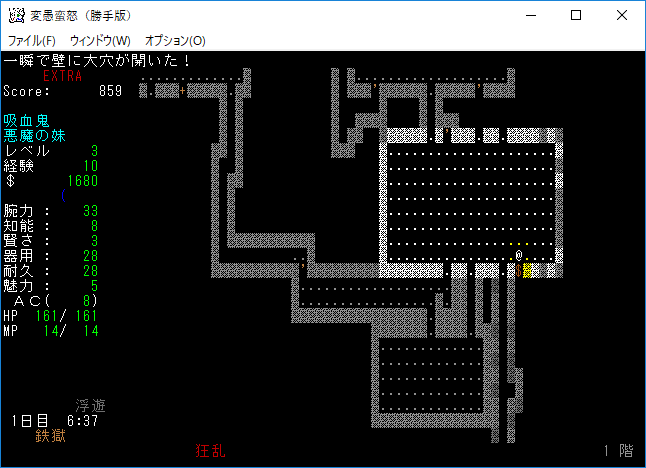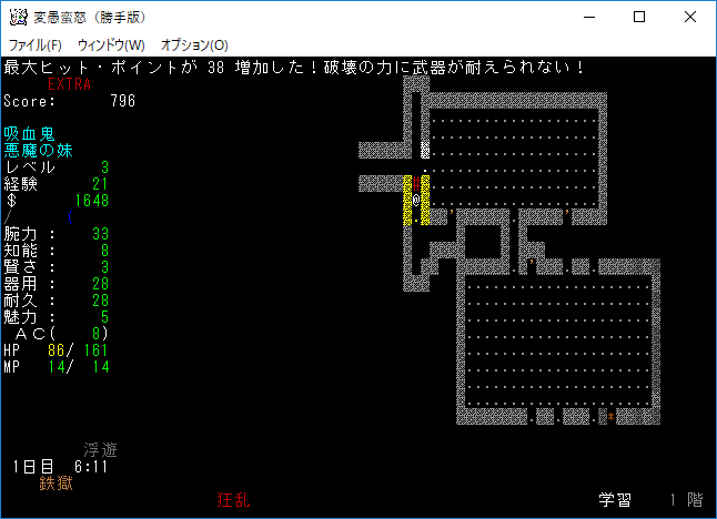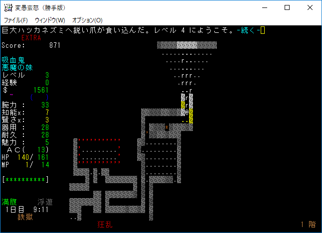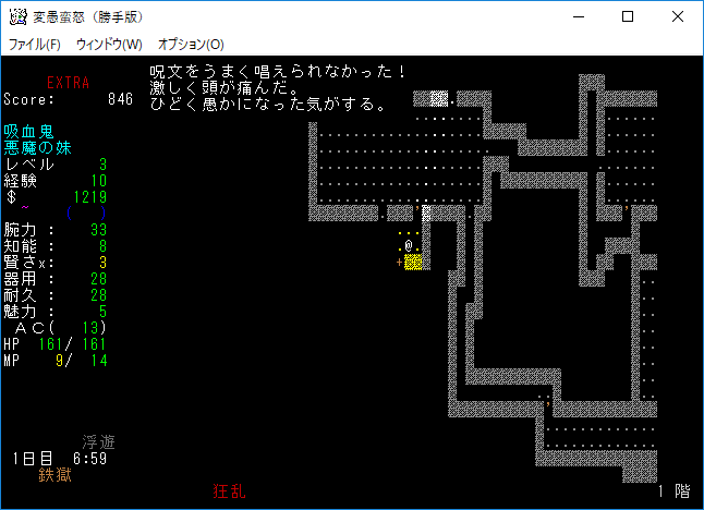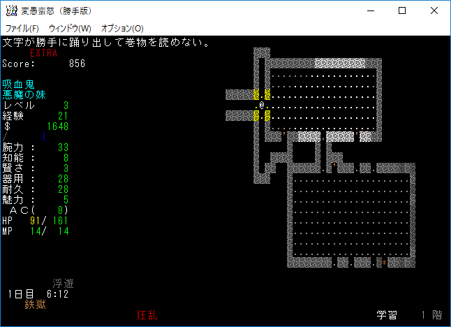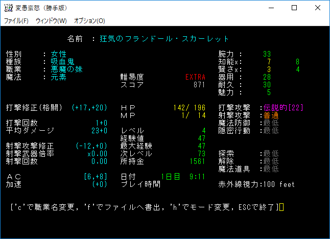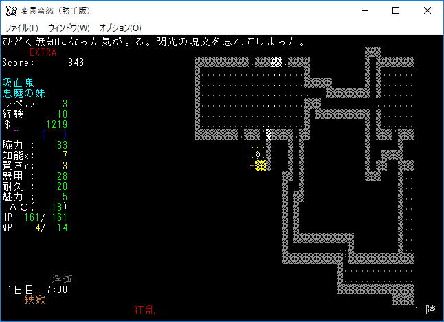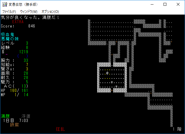 変愚蛮怒東方Project勝手版のプレイ日記を始めます。難易度EXTRAのフランドール・スカーレットをプレイ中です。吸血鬼は特殊能力『生命力吸収』で空腹を満たすことができる。餓死はしないだろうからマッタリとプレイをしようぜ。