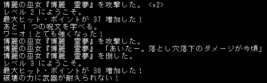 一発ぶん殴っただけで霊夢を倒してしまった。序盤の狂戦士は反則みたいな強さですね。霊夢1人の経験値でレベルが3になったのは驚いた。パチュリーよりもレベルが上がりやすい気がします。
