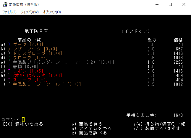 地下1階の施設は防具屋のようです。鑑定できる施設だったら嬉しかったのに。まあ巻物屋よりはマシだったと喜びましょう。