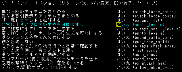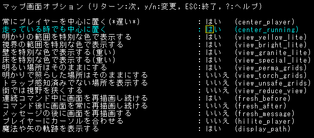 『プレイヤーを中心に置く』をはいに設定。最近の変愚はデフォルトで魔法や矢の軌跡を表示してくれるんですね。