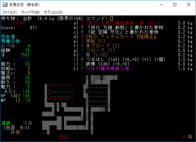 狂乱のせいかアイテムカードを使えません。数分後に巻物も読めないことを知ります。テレポートを使えないのは怖すぎるな。メイジ職よりも立ち回りは難しそうです。