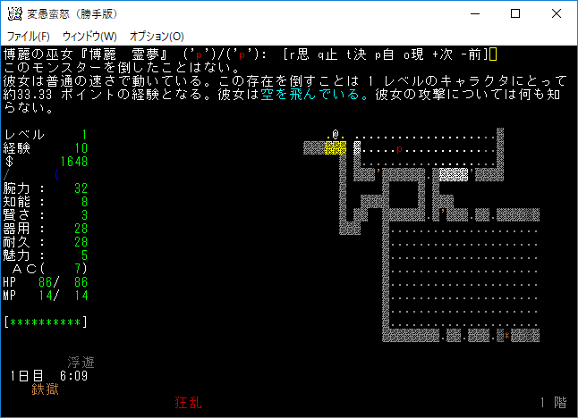 見習いメイジかと思ったら『博麗 霊夢』と遭遇した。ちょこっと移動しただけなのにユニークモンスターと戦闘になっちゃった。隠密『最低』はセクシーギャルみたいだ。