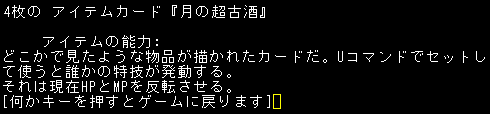 アイテムカード『月の超古酒』が落ちているのを発見。効果は魔法戦士のレイシャルですよね。チルノちゃんが発動させたら瀕死の重傷を負ってしまうぞ。