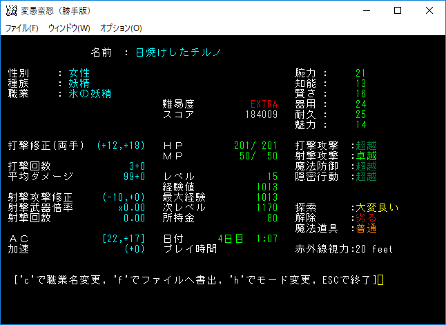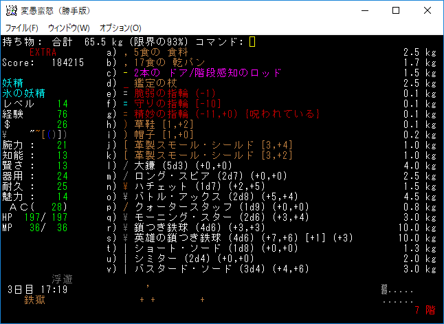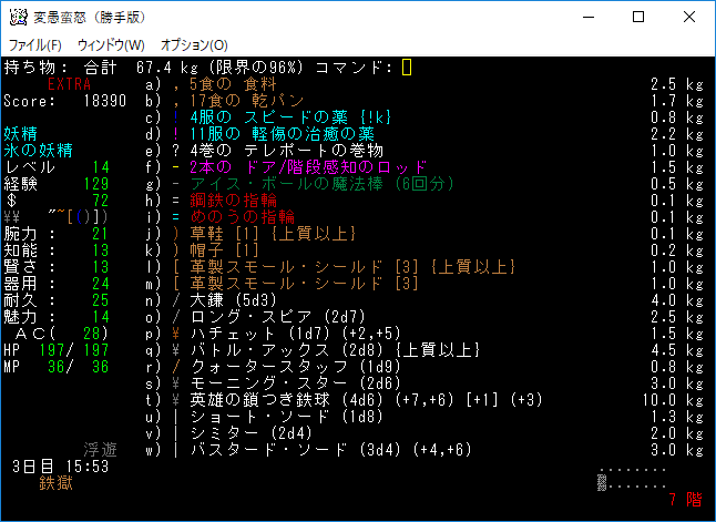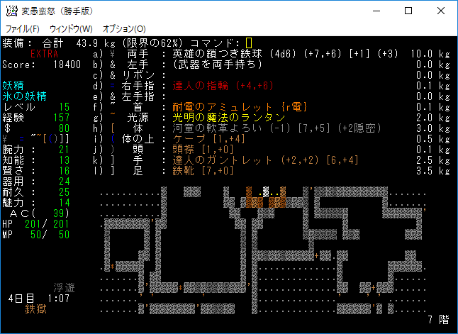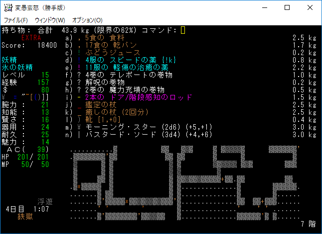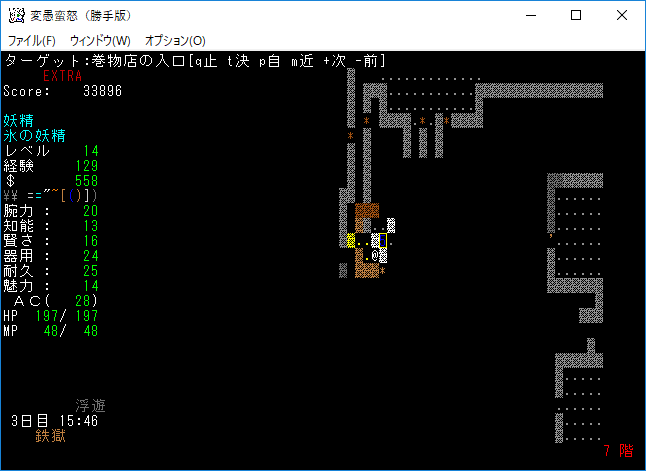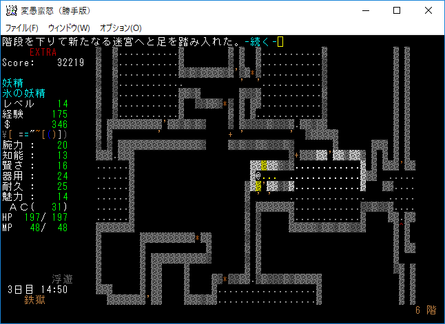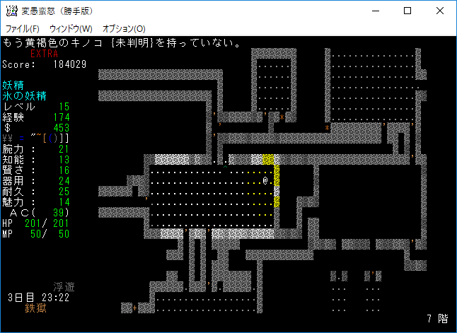 変愚蛮怒東方Project勝手版のプレイ日記を始めます。難易度EXTRAの日焼けしたチルノをプレイ中です。鉄獄6階の探索はそろそろ終わりそうだ。やっぱり簡易鑑定ができないと難しいですね。武器を回収するためにドア/階段感知のロッドをぶっ壊したよ。