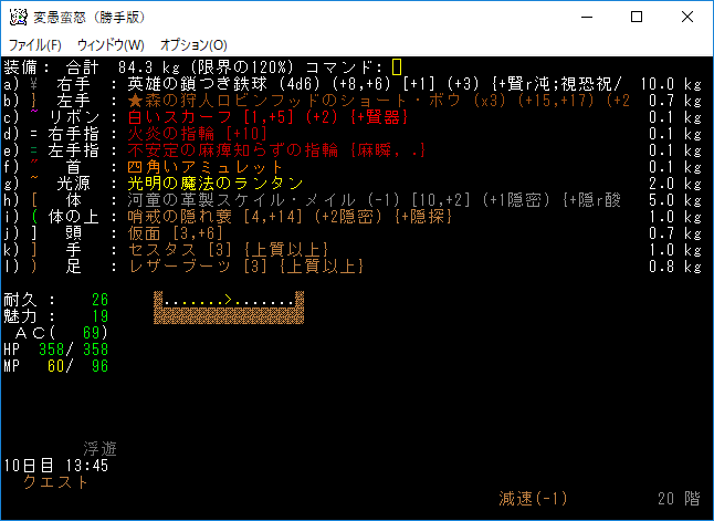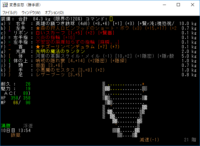 現在の装備品は上の画像。頭、手、足のどこかに高級品かアーティファクトが欲しい。また霖之助に会いたいですなあ。