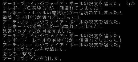 アーチ=ヴァイルに巻物を壊されまくった(泣)。発見したら即殺するくらいの気概で挑むべきだった。冷気が効かないからなかなか難しいのです。