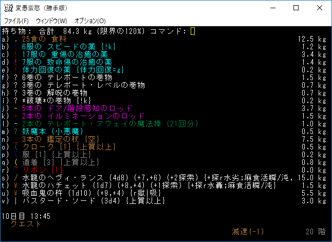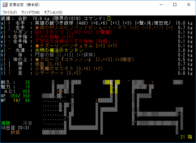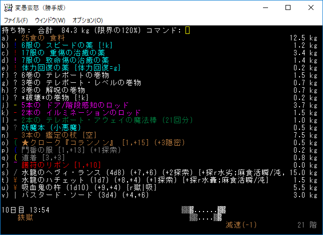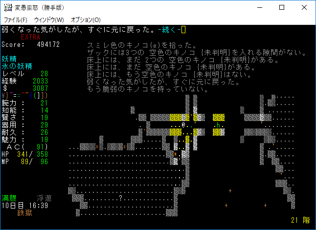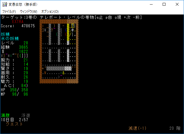 ミミックの部屋にテレポート・レベルの巻物が落ちていやがった。ここで呼んでいたら大惨事になっていたな。地下19階で読んだのは運が良かったとポジティブに考えます。