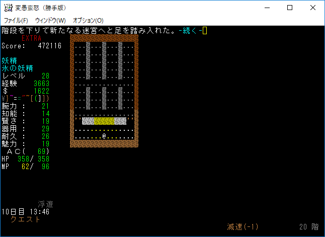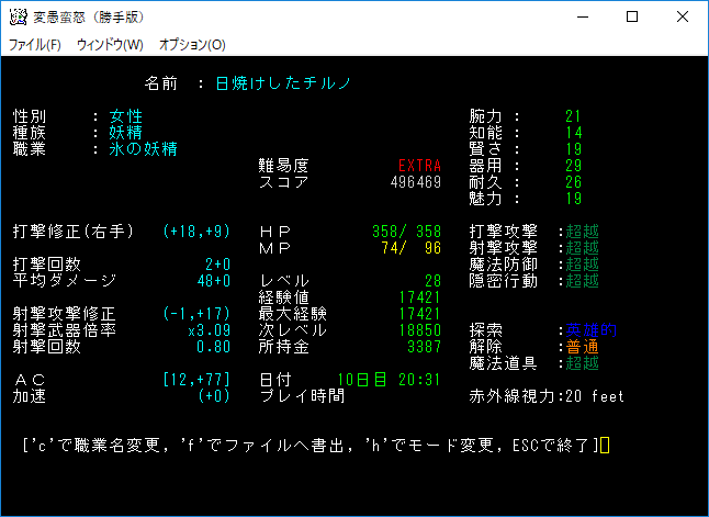 変愚蛮怒東方Project勝手版のプレイ日記を始めます。難易度EXTRAの日焼けしたチルノをプレイ中です。『ミミックの財宝』クエストを達成しました。鑑定手段はないけど頑張って取捨選択をしよう。
