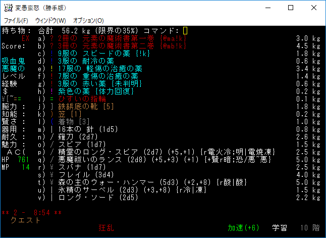 装備品は大して変わっていませんね。ザックの中身を鑑定できればマシになるでしょう。混乱耐性がないのはちょっと怖いかな。