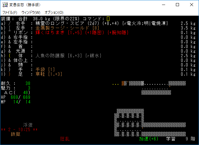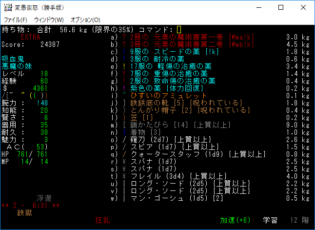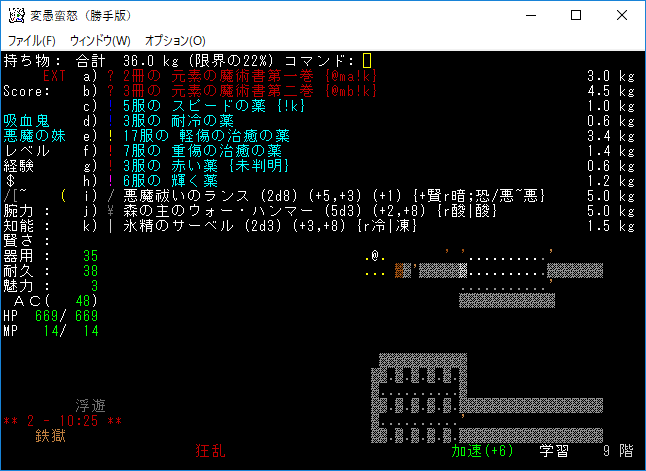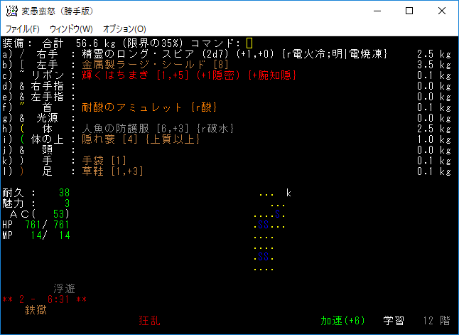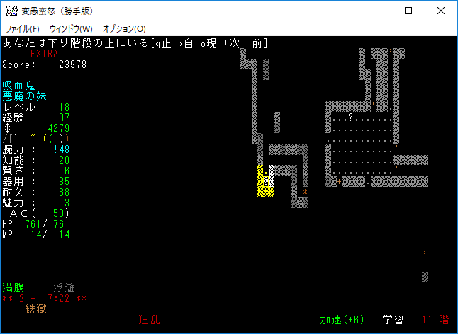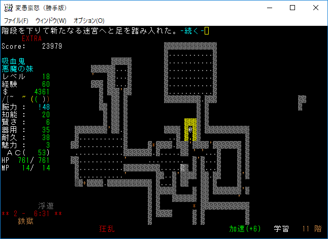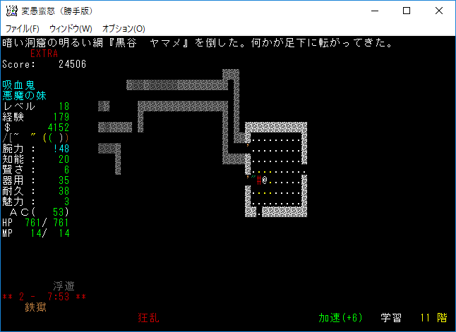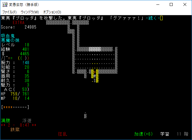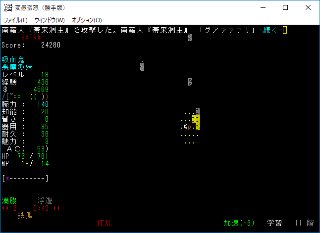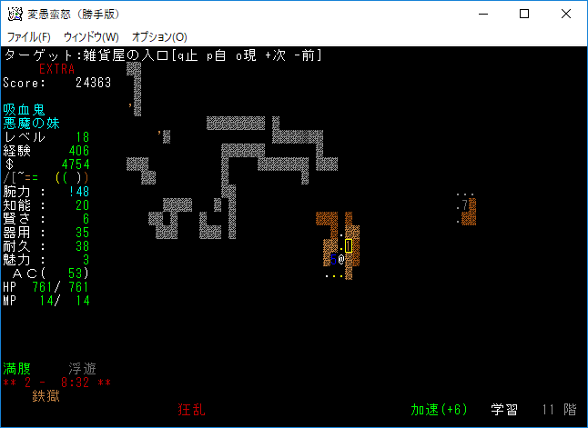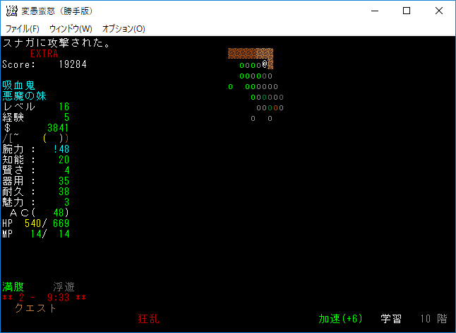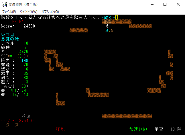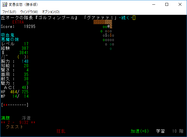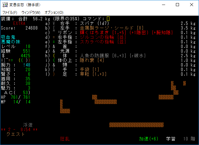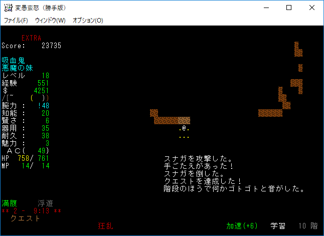 装備品に恵まれなくても妹様は強い。混乱耐性をつければ地下30階くらいまでは無敵だろう。それでは地下10階に降りてオークのキャンプクエストを遂行します。