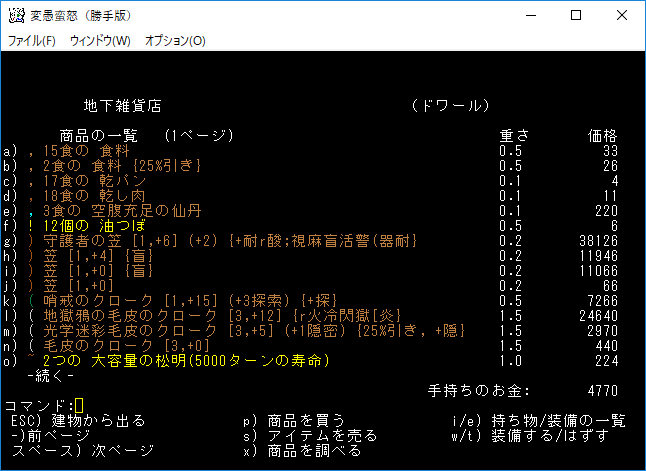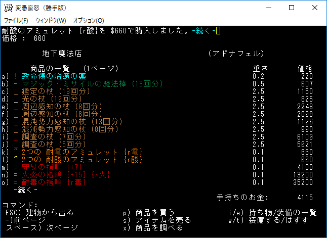何も買わないのは空しいから耐酸のアミュレットを購入。未鑑定の指輪を1$で売ったら耐毒の指輪だった。売値が35200$に跳ね上がるのは酷いと思う(笑)。