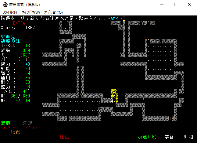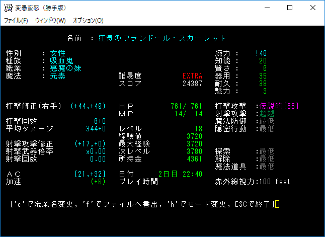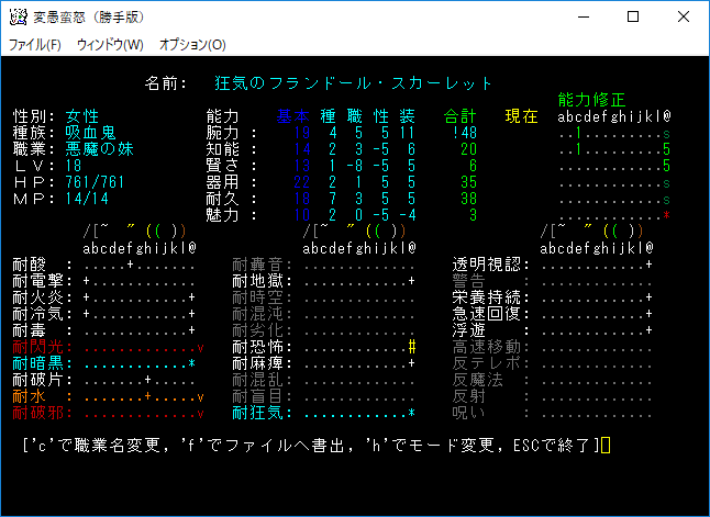 変愚蛮怒東方Project勝手版のプレイ日記を始めます。狂気のフランドール・スカーレットをプレイ中です。チルノちゃんは俺が下手なせいで倒されてしまった。突然変異の治療に期待をしてひたすら階段を降りよう。