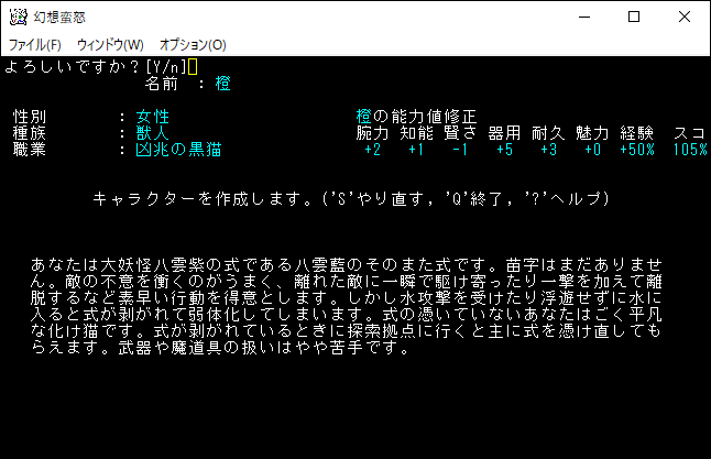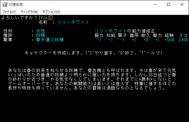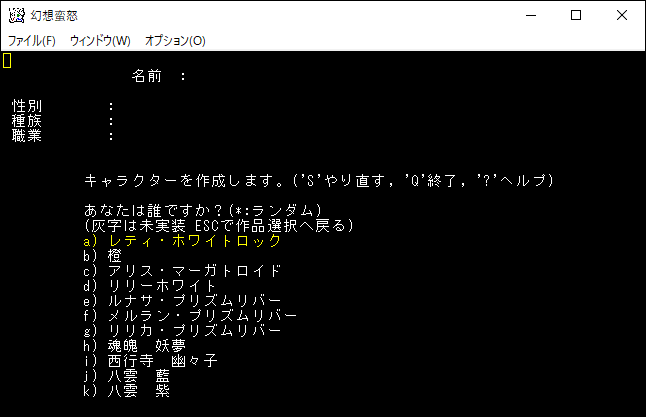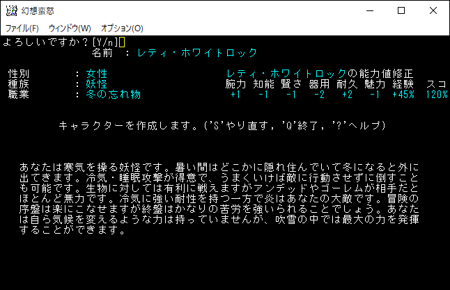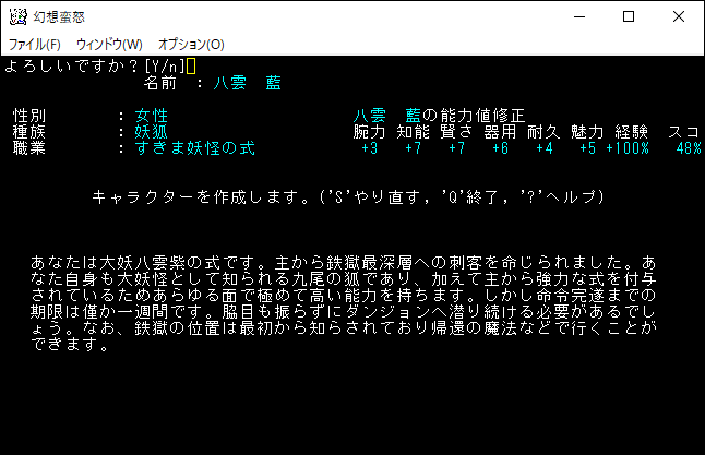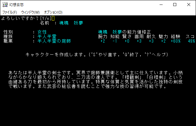 西行寺幽々子は死霊魔法と近接攻撃を得意とするデュアルだ。たぶん本家の混沌の戦士(悪魔)を強化した性能だろう。幽々子はレミリアと同じくらい強いんじゃないの。幽々子は僕を*勝利*に導いてくれそうな気がしますので(笑)、プレイキャラクターの候補にします。