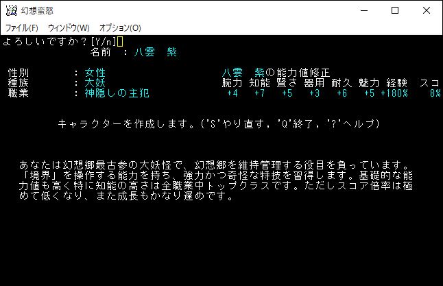 八雲紫は能力値が全職業中トップクラスに強いキャラクターだ。だけどwikiを読んだらマニア(上級者)しか使いこなせないと書いてあった(笑)。先人の教えには従っておきましょう。俺は初心者なので八雲紫は選びません。