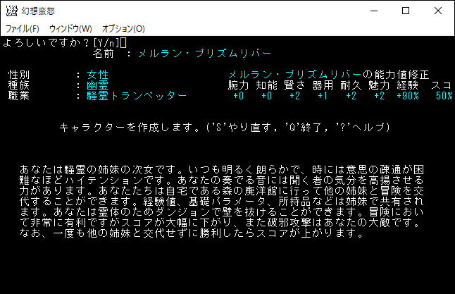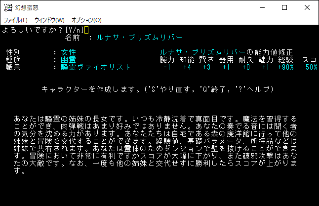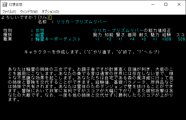 ルナサ・プリズムリバーは魔法が得意なユニーククラスです。このキャラクター独自の能力として、プレイ中に他の姉妹と交代できると書かれています。これは本家には無いシステムなので面白そうだぞ。しかも種族が幽霊だから絶対に強いだろう。ルナサ・プリズムリバーは選ぶかもしれません。