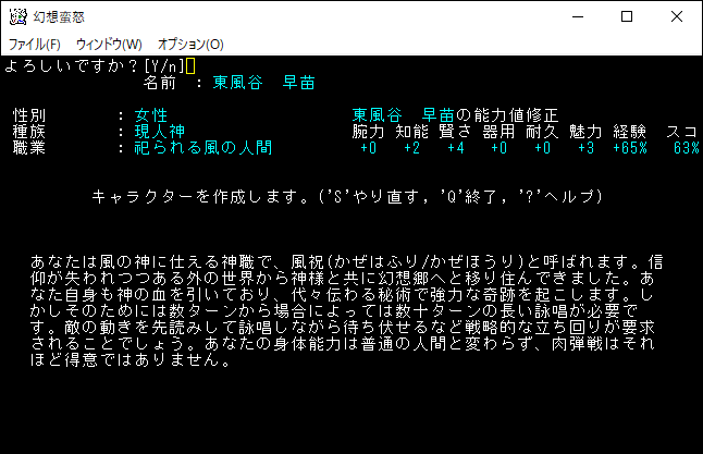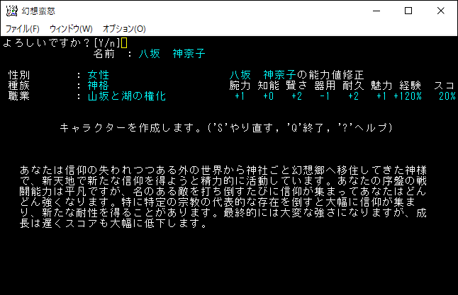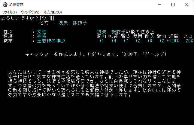 洩矢諏訪子は「変容、暗黒、死霊、混沌」の魔法を領域変更なしで使用できる、妖術系のスペルマスターだ。HPの上昇率が高いのでスペルマスターの低耐久力が緩和されている。諏訪子の特筆するべき能力は人間型生物を倒したときに最大MPが上昇するというものです。育成すれば最大MPを999にして魔法を連打できるらしい。諏訪子は何かの冗談かと思うくらい強いぞ。たぶんヤマザナドゥよりも楽に勝利できる。プレイ日記でこんなに強いキャラクターを使用しても許されるのかね。自分、諏訪子を選んでも良いですか(笑)?。とりあえずは候補に入れておきます。