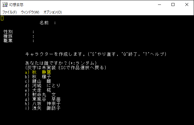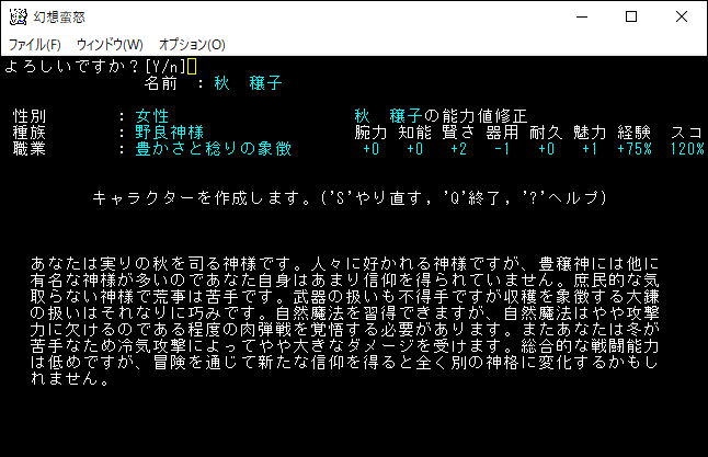 秋穣子の種族も先ほどの静葉と同じく「野良神様」だ。自然領域の魔法を習得できるため、格闘と魔法のデュアルになるわけだな。野良神様の強力な神性変化を狙えば無敵のキャラクターに化けるかもしれない。だけど欲しい神性変化を狙うのは難しそうだから諦めよう。楽しめそうなキャラクターなんだけどね。
