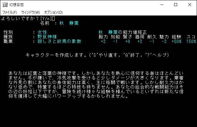 秋静葉の種族は「野良神様」です。計画的にゲームを進行していくと強力な能力を取得することができます。魔法の習得は不可能だ。主な攻撃手段は格闘になるようです。俺の実力では計画的に育てるのは無理だな。静葉は面白そうだけど上級者向けだと思うので諦めます。