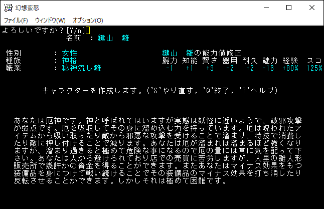 鍵山雛は呪われた装備品などを活用する厄神です。普通のプレイなら捨ててしまうような呪われたアーティファクトを拾いまくるのだ。他の勝手版に似たような職業があったけど、こちらの方が洗練されている。このゲームをやり込んだ人なら価値観が真逆になるので楽しめると思う。初心者の俺だと「厄」の管理が難しくて自爆しそうだ。俺は神経質だから自爆というリスクがあるとプレイに集中できない。
