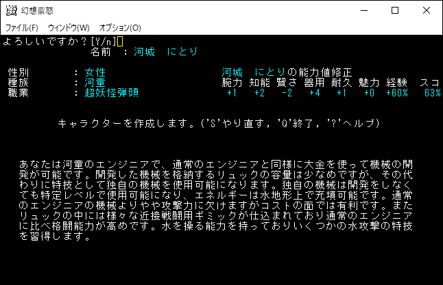 河城にとりは独自の機械を開発するエンジニアだ。最終的には混沌のサーペントを瞬殺できるほどの火力を出せるらしい。欠点は金の消費が激しいことだろう。エンジニアは幻想蛮怒にしか存在しないシステムだろうから遊んでみたいぜ。初心者向けなのかは不明だけどプレイキャラクターの候補に入れておきます。