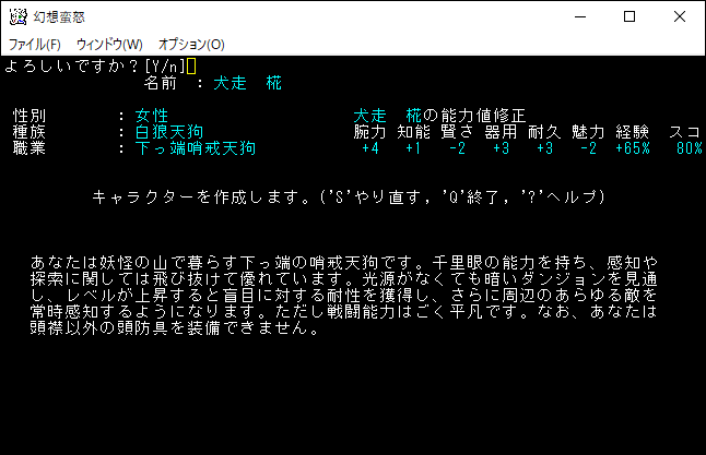 犬走椛は感知の能力に長けた近接攻撃のキャラクターです。変愚蛮怒は感知をしまくれば、危険な敵を避けつつ、美味しい敵を狩って勝利できる。しかし、それはあくまでも本家変愚蛮怒の話であり、幻想蛮怒はユニークモンスターが強すぎるため苦戦を強いられるだろう。感知は便利なんだけどね。椛を使うなら予見のレミリアで良いんじゃないのと思ってしまう。