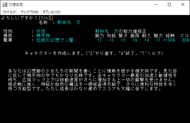 射命丸文は人気のあるキャラクターなのか、よくネットで見かけます。しかし、よく見かけたのは昔の話であり、現在よく見かけるキャラクターはずんだもんだ。射命丸は全ユニーククラスの中でトップの加速があり、特技が強く、魔法も習得できます。初心者が勝利を目指すには調度良いキャラクターなのでしょう。僕は初心者なのでプレイキャラクターの候補に入れます。
