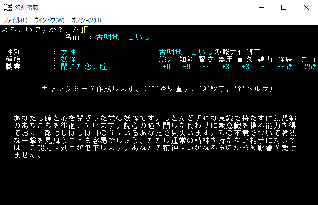 古明地さとりは対峙する敵の心を読み、敵の能力を使用して戦うユニーククラスだ。本家の「ものまね師」を使いやすくしたクラスなのかね。配下(本家のペット)の特技を使用していくと快適に戦えるらしい。多彩な戦術を用いることになるためプレイ中に飽きることはないだろう。今すぐ遊んでみたいと思うくらい魅力的なキャラクターです。プレイキャラクターの候補に入れておきます。