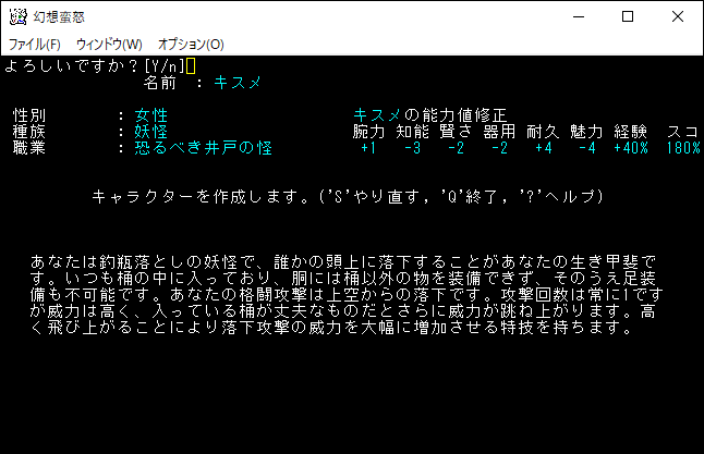 キスメは特技の「飛び上がる」により空中を浮遊して近接攻撃のボーナスを得るユニーククラスです。魔法を習得することはできないようだ。近接攻撃オンリーの時点で俺のような下手クソには使いこなせないクラスだろう。装備制限も厳しいので上級者向けだな。