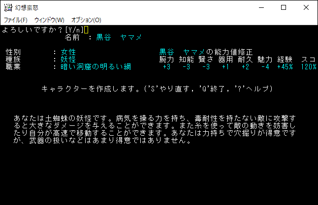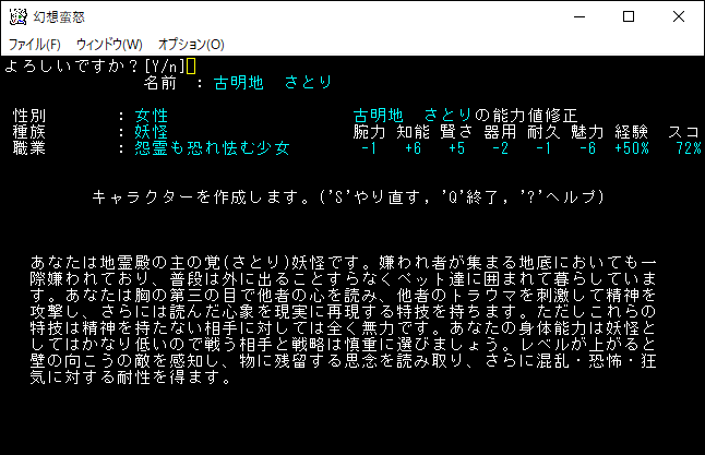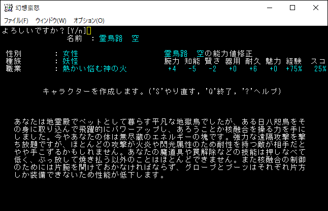 霊烏路空はビームやレーザーなど強力な遠距離攻撃で戦うユニーククラスです。戦闘中にMPが尽きても特技により回復することができます。しかし、習得する遠距離攻撃の属性が火炎や閃光ばかりなので、火炎耐性、閃光耐性を持つモンスターには手こずるだろう。火炎属性と閃光属性の両方を持つモンスターには苦戦を強いられてしまう。それでも変愚蛮怒は遠距離から攻撃すると有利なので、霊烏路空は強いキャラクターだと言える。ただ魔道具の扱いが苦手なため感知は絶望的になります。俺は下手クソだから感知が無いと探索できない。霊烏路空の採用は諦めます。