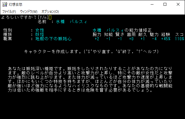 水橋パルスィは「嫉視」や「嫉妬」など独自の特技を使用できます。嫉視や嫉妬は自分よりもレベルの高いモンスターに効果的です。さらにHPが減っていると自身がパワーアップする特性もある。水橋パルスィの本領を発揮するにはリスクを抱えながら戦う必要があるのだ。非常に面白いシステムなのだけど扱うのは難しいキャラクターだろう。このゲームをやり込んでモンスターの戦闘力を頭に叩き込まないと使いこなせない。