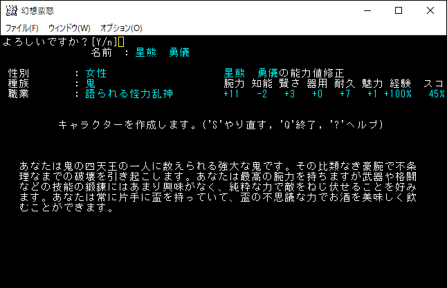 星熊勇儀は圧倒的なHPと攻撃力でモンスターをねじ伏せていくユニーククラスだ。本家の戦士を強化したクラスだと思います。特技で*破壊*を使用できるため強キャラクターなのだろう。だけど殴りメインのキャラクターならフランドール・スカーレットか射命丸を選びたいかなあ。俺は本家で魔法職ばかりプレイしていたから近接職は自信がありません。