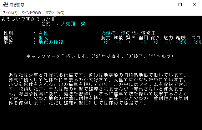 火焔猫燐は火炎攻撃を得意とする化猫だ。燐の火炎攻撃は強力であり耐性を持っている敵でも焼き払うことができる。さらに「変容、暗黒、死霊、混沌」の魔法領域を、どれか1つ習得することができます。死霊の魔法にある幽体化を習得すれば*勝利*を狙えるんじゃないかな。攻撃力は問題ないけど感知が貧弱なのが難点だ。それでもプレイキャラクターの候補に入れます。