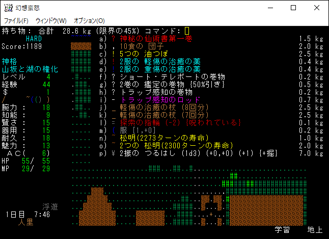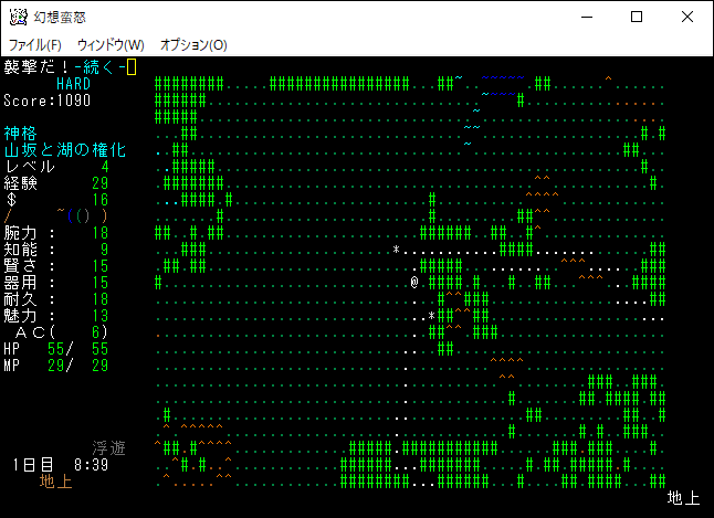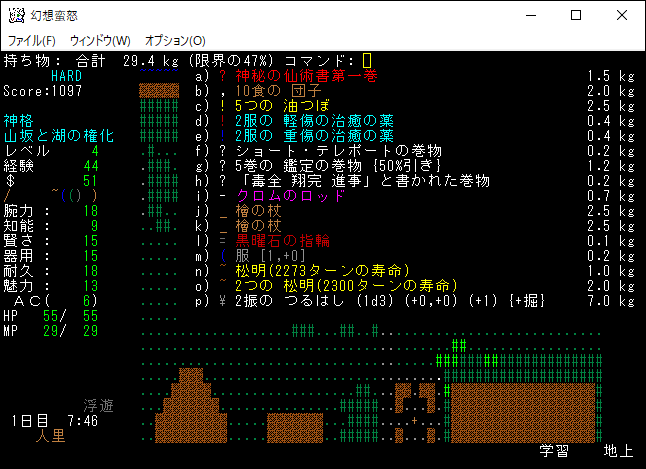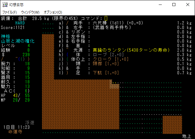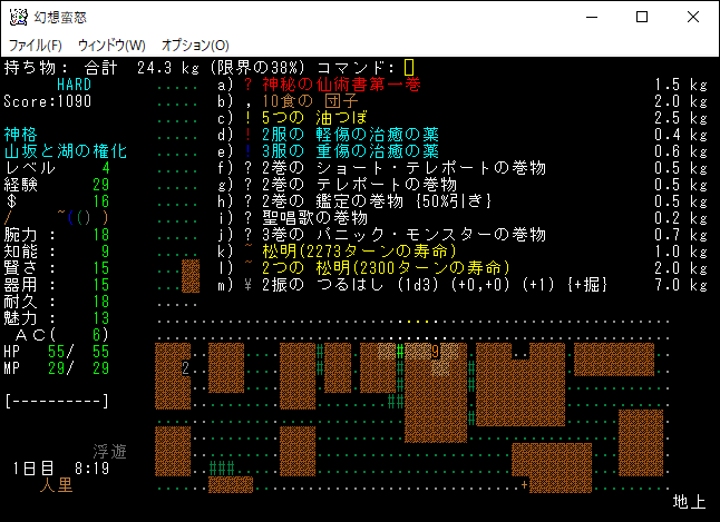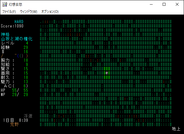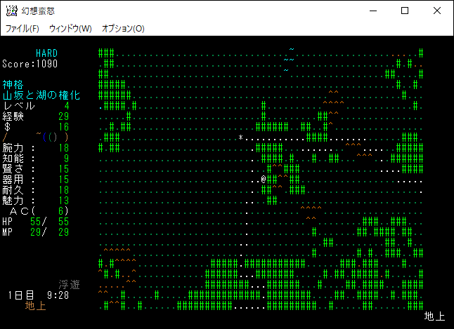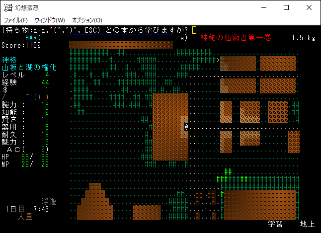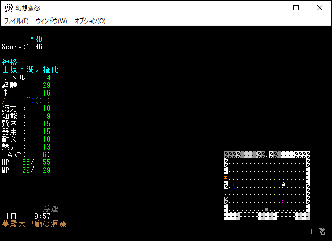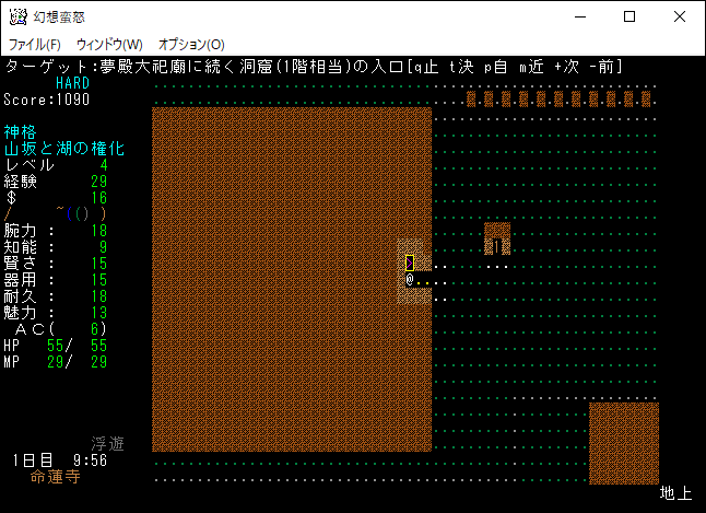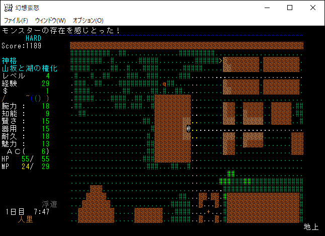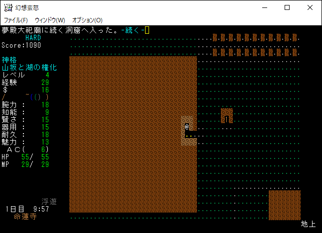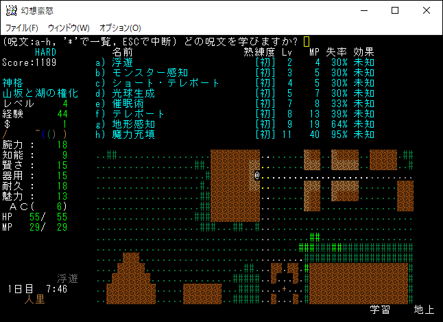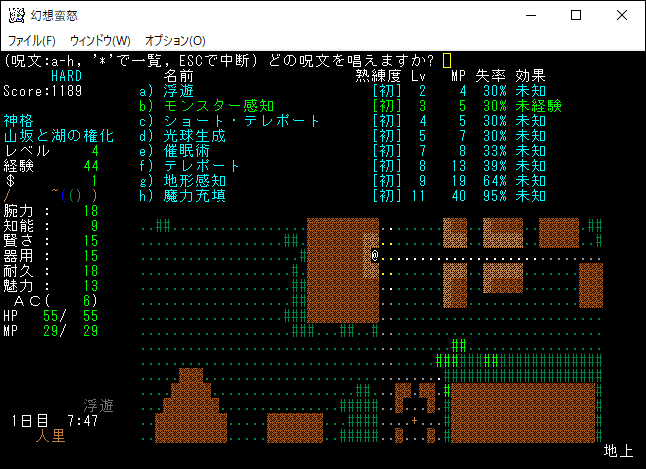 そんなわけで、さっそく習得したモンスター感知を唱えてしまう。未経験の魔法を唱えると経験値を得ることができます。このボーナス経験値のおかげで魔理沙はスタート直後からレベルが上がりまくった。難易度がHARDになったし、少しでも経験値は稼いでおきたい。