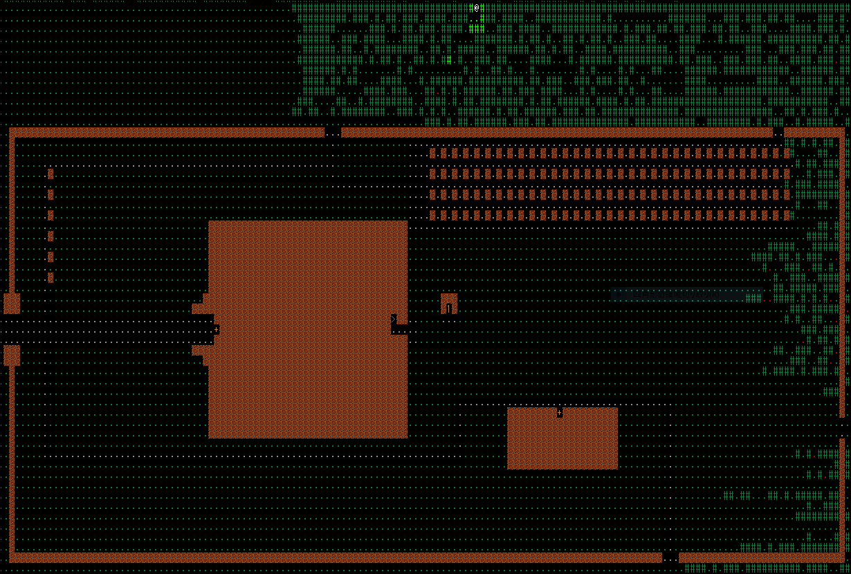 幻想蛮怒にはイークの洞窟が存在しない。スタート地点から最も近い簡単な迷宮は夢殿大祀廟だ。夢殿大祀廟はイークの洞窟とは違って街から離れているんだよ。上の画像の「@」がスタート地点の人里です。夢殿大祀廟は人里の右下にある白い「*」の場所にある。広域マップで歩いている途中、危険なモンスターに襲撃されたら無残に敗北するだろう。