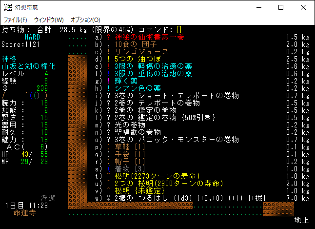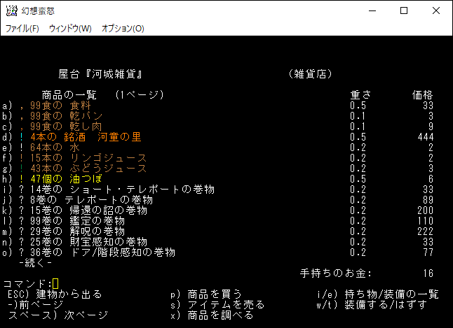 盗賊クエストの戦利品を売却しました。そして旅立ちの準備を整えた(上の画像)。ユニークモンスター対策のパニック・モンスターと緊急待避用のテレポートの巻物を買ったくらいかな。なにしろ、これから向かう夢殿大祀廟は遠いからね。