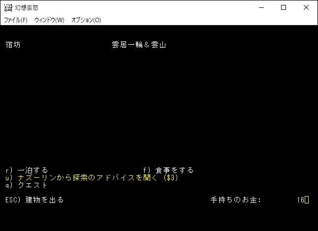 3つ目の施設は雲居一輪と雲山が経営している宿坊です。食事や休憩ができるしクエストの受領も可能だ。ナズーリンからのアドバイスというのは謎だな。まあ中盤あたりで利用する事になるだろう。
