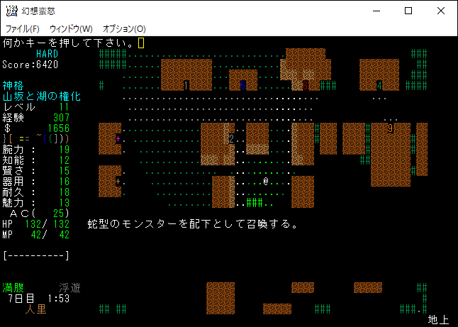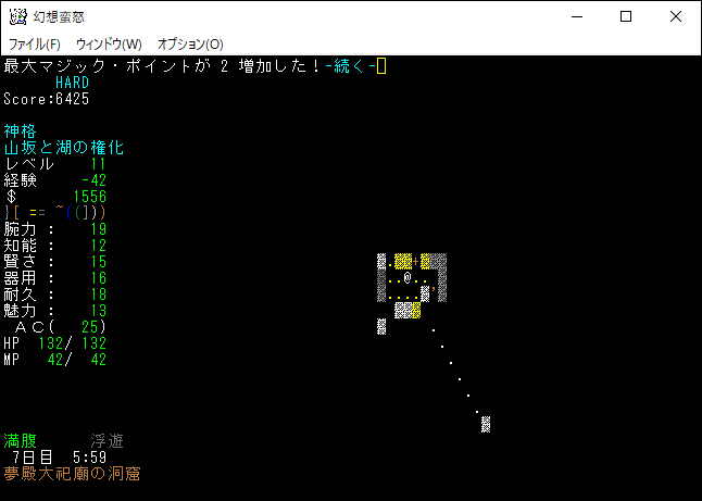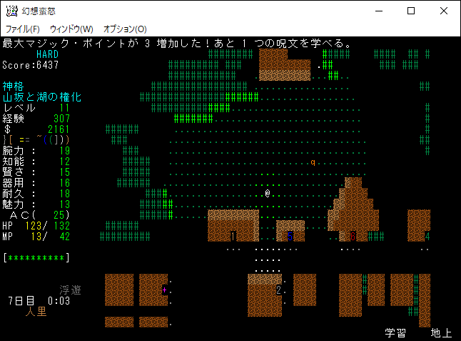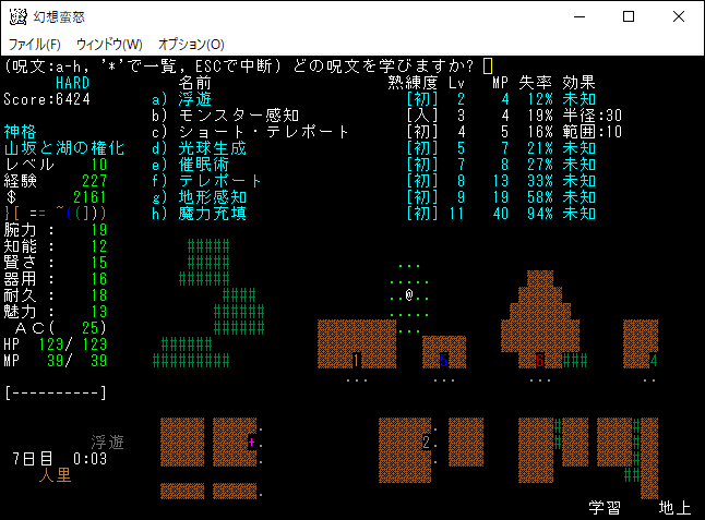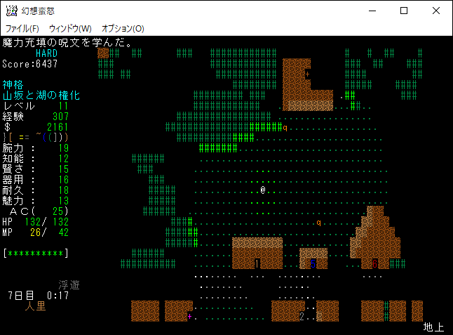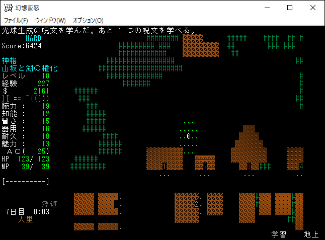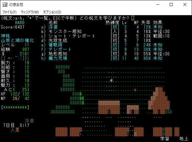 次は経験値稼ぎのために習得した魔法を唱えてしまおう。光球生成と地形感知を唱えたところレベルが11に上がりました。レベルの上昇により、さらに呪文を1つ習得できるようになった。魔理沙のときも思ったが、未経験の魔法を唱えたときの経験値ボーナスは大きい。