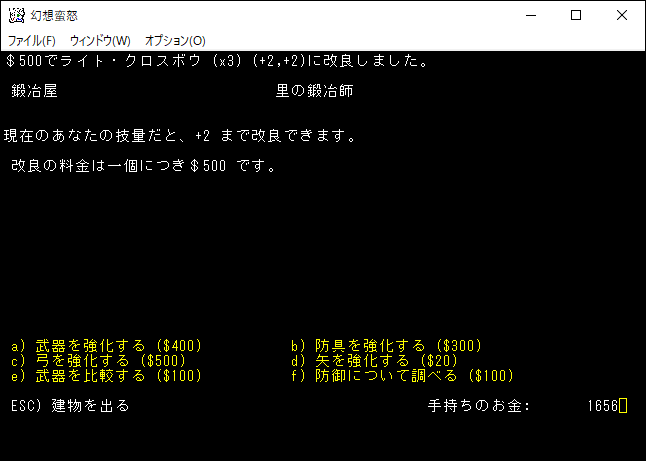 まだまだ探索の前に準備したいことはあります。レベルが10になり武器、防具を+2まで強化できるようになった。鍛冶屋でライト・クロスボウを+2に強化しておきましょう。よしよし、加奈子の火力が少しずつ強化されている。
